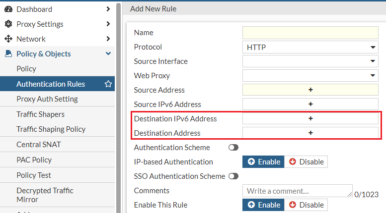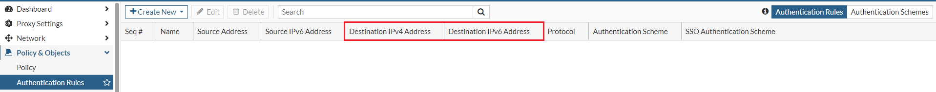 The Authentication Rules table now includes the new Destination IP columns which show the destination IP information.