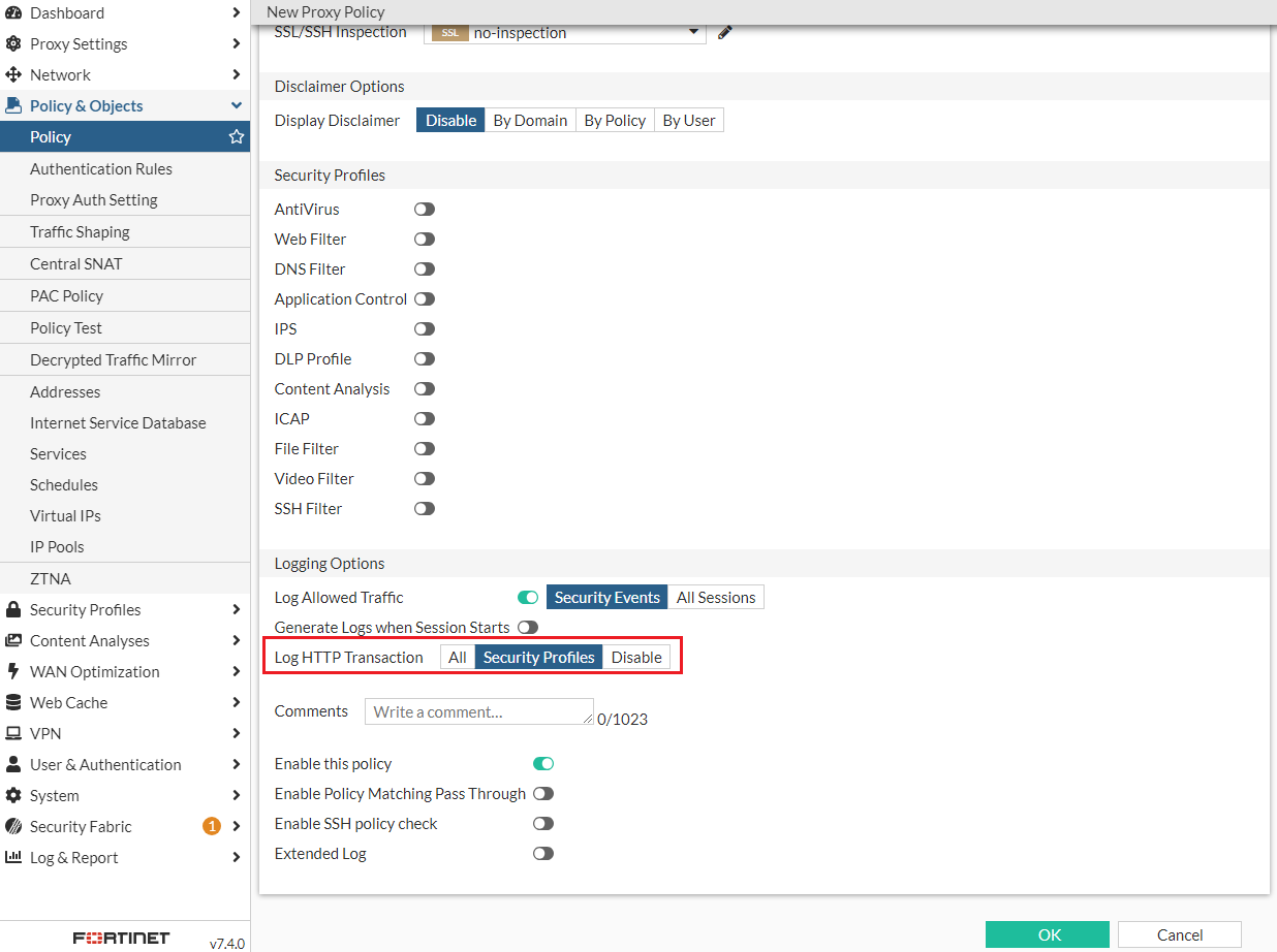 Under Policy & Objects > Policy, when you create or edit a profile, the options for Log HTTP Transaction changed from Enable and Disable to All, Security Profiles, Disable.
