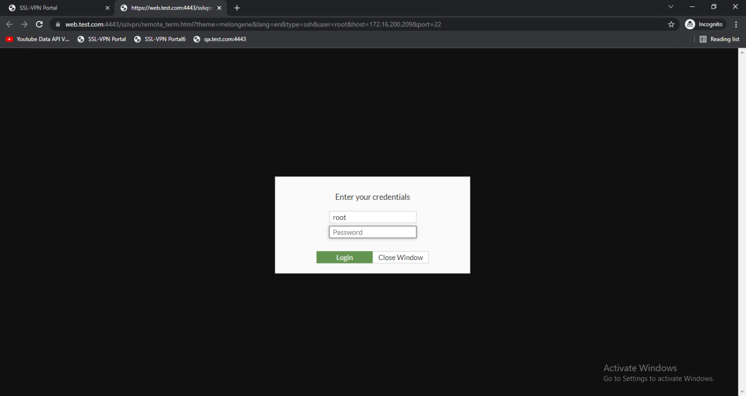 - From the web portal, click another bookmark, such as SSH. The page opens with the credential login screen to access the server.