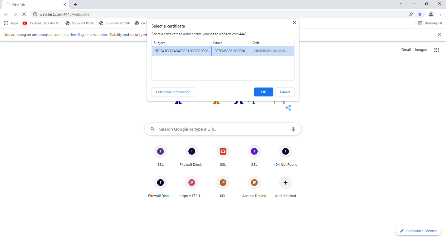 ssl-certificatecan be replaced with a server certificate:config firewall vip edit "ztna_webportal" set type access-proxy set extip 172.18.62.68 set extintf "any" set server-type https set extport 4443 set ssl-certificate "*.test.com" next end