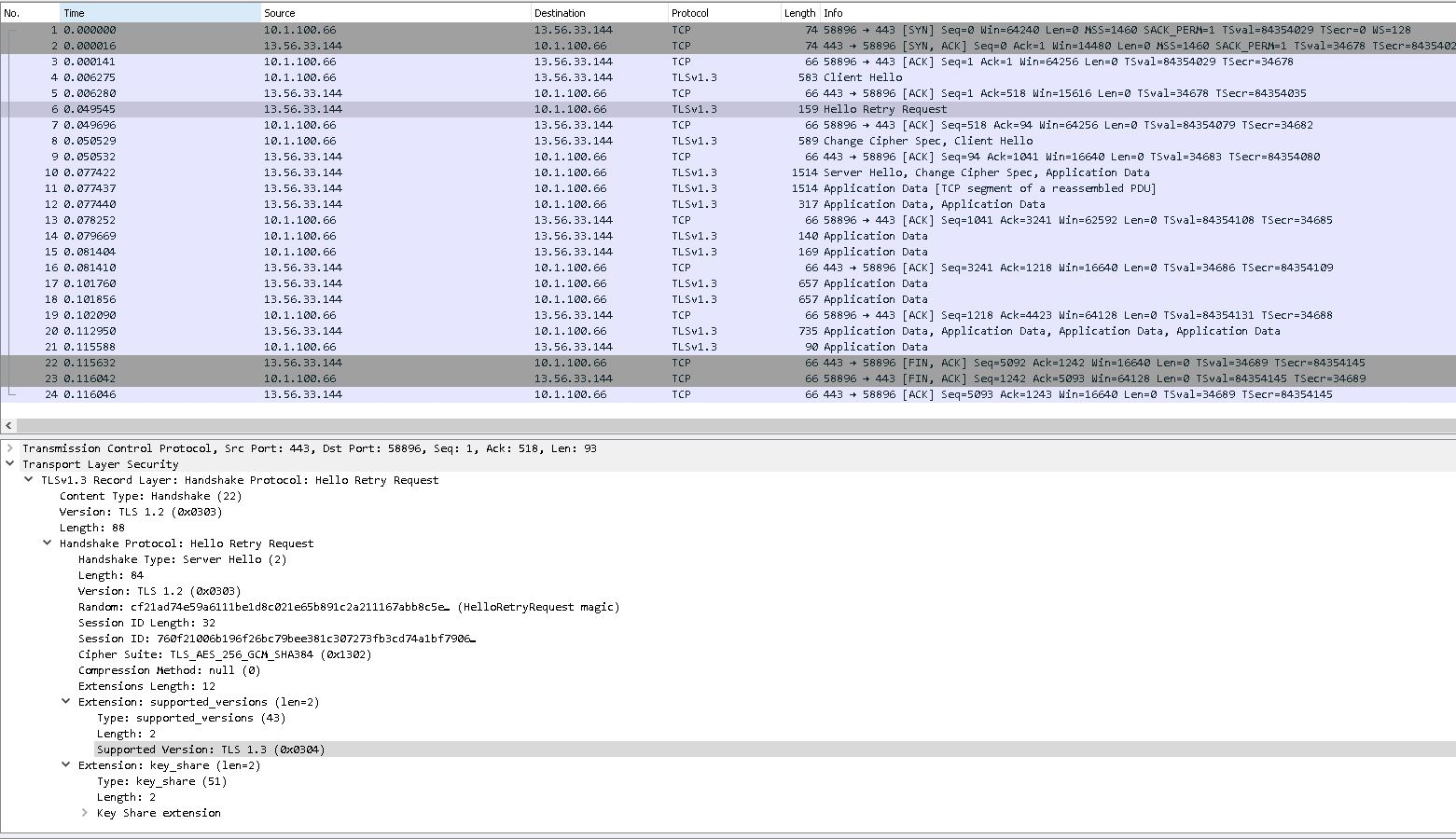 The following output from the Squid server demonstrates that the FortiProxy forwards the hello retry request back to the client PC. The client PC then sends the client hello again, and the connection is successfully established.