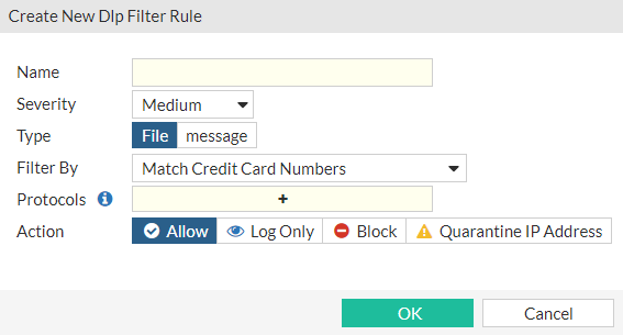 Configure the following settings in the Create New Dlp Filter Rule window or the Edit Dlp Filter Rule window and then click OK.