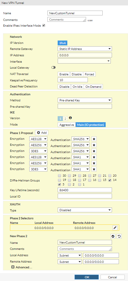 If you select Custom for the template type in the IPsec Wizard and then select Next, the New VPN Tunnel window opens.