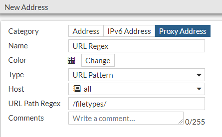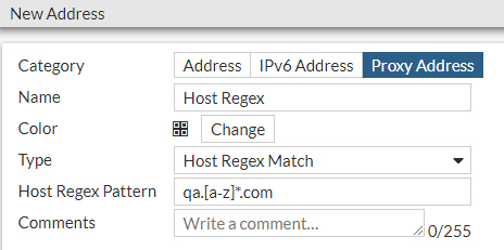 In this address type, a user can create a HTTP header as a regular expression. Once created, the header address can be selected as a source of a firewall policy. This means that a policy will only allow or block requests where the HTTP header matches the regular expression.