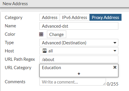 This example creates an address with the URL pattern /about that are in the Education category. For more information about categories, see https://fortiguard.com/webfilter/categories.