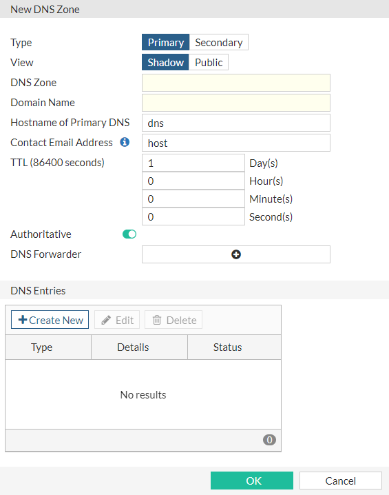 Select the accessibility of the DNS server. If you select Public, external users can use the DNS server. If you select Shadow, only internal users can use it.