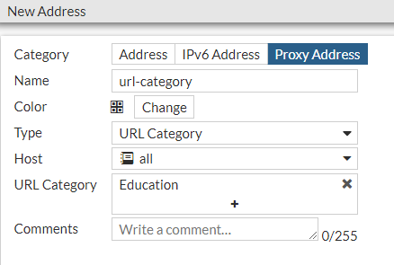 The example creates a URL category address for URLs in the Education category. For more information about categories, see https://fortiguard.com/webfilter/categories.