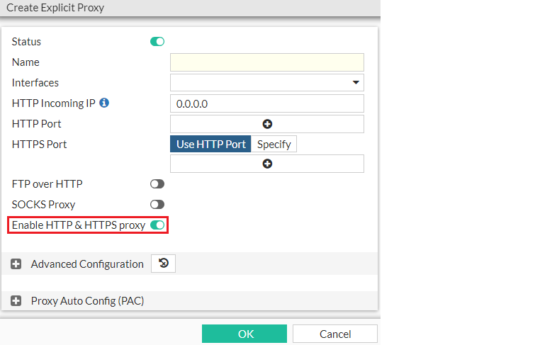 FortiProxy 7.2.8 adds the Enable HTTP/HTTPS proxy option when you create or edit an explicit proxy. The default is enabled. Alternatively, use the set http [enable|disable] option in the config web-proxy explicit-proxy command.