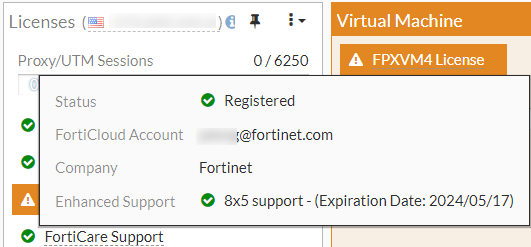 After the transfer is complete, the new the FortiCloud account is displayed in the Licenses widget.
