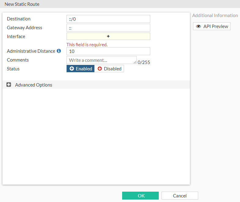 Select Enabled or Disabled to set the status of the new static route.