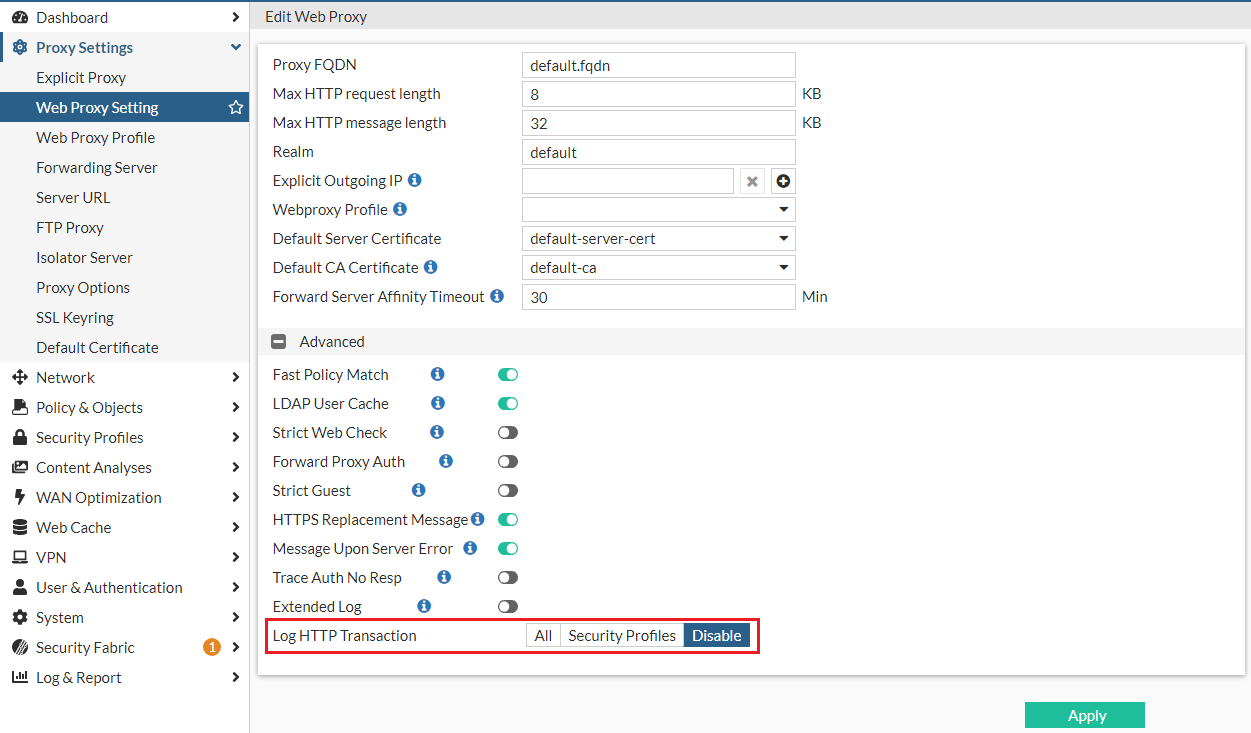 Under Proxy Settings > Web Proxy Setting, the Http Transaction field is renamed Log HTTP Transaction and the options changed from Enable and Disable to All, Security Profiles, Disable.