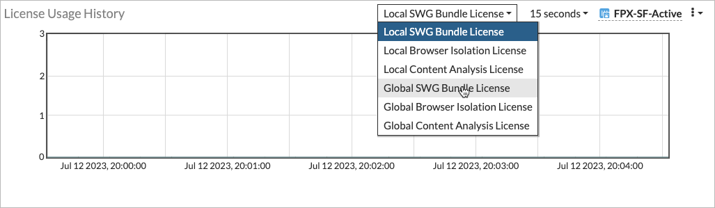 The License Usage History widget can show both the Global or Local SWG Bundle License, Browser Isolation License, and Content Analysis License usage.