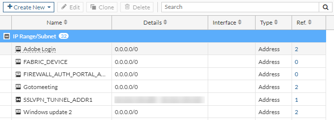 Web cache addresses in the address list are grouped by type: Address, Address Group, IPv6 Address, IPv6 Address Group, Proxy Address, Proxy Group, IPv6 Proxy Address, IPv6 Proxy Group. A FortiProxy unit’s default configurations include all address, which represents any IPv4 IP address on any network. You can also add a firewall address list when configuring a security policy.