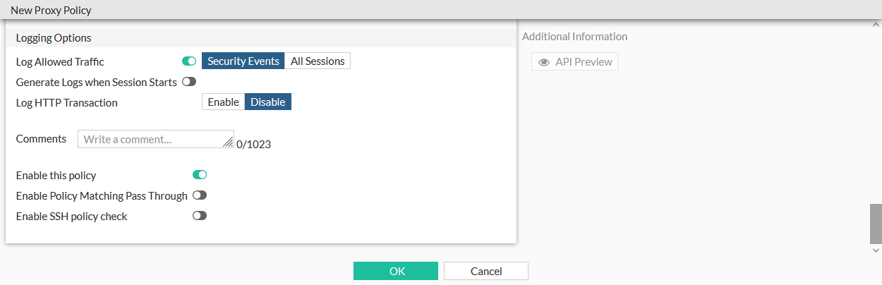 SSH policy check is disabled by default, and can be enabled in transparent and explicit-web policies. When it is enabled, SSH policy matching will only match the SSH policy.
