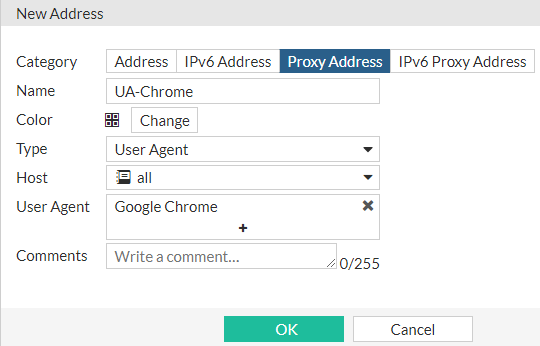 In this address type, a user can create an address based on the names of the browsers that are used as user agents. Multiple browsers are supported, such as Chrome, Firefox, Internet Explorer, and others. Once created, the address can be selected as a source of a firewall policy. This means that a policy will only allow or block requests from the specified user agent.