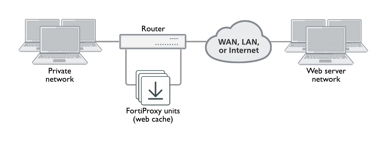 Most commonly the topology uses a router to route HTTP and HTTPS traffic to be cached to one or more FortiProxy units. Traffic that should not be cached bypasses the FortiProxy units. This is a scalable topology that allows you to add more FortiProxy units if usage increases.