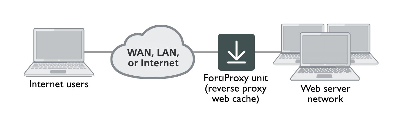 You can also configure reverse proxy web caching. In this configuration, users on the Internet browse to a web server installed behind a FortiProxy unit. The FortiProxy unit intercepts the web traffic (HTTP and HTTPS) and caches pages from the web server. Reverse proxy web caching on the FortiProxy unit reduces the number of requests that the web server must handle, leaving it free to process new requests that it has not serviced before. Because all traffic is to be cached, the FortiProxy unit can be installed in transparent mode directly between the web server and the Internet.