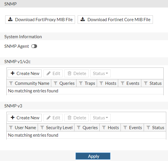 Enable the FortiProxy SNMP agent. See SNMP agent. |