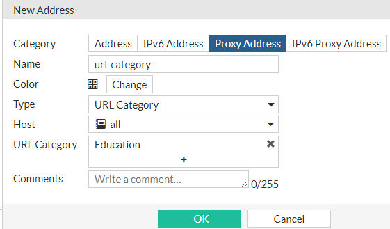 In this address type, a user can create a URL category based on a FortiGuard URL ID. Once created, the address can be selected as a destination of a firewall policy. This means that a policy will only allow or block requests that match the URL category.