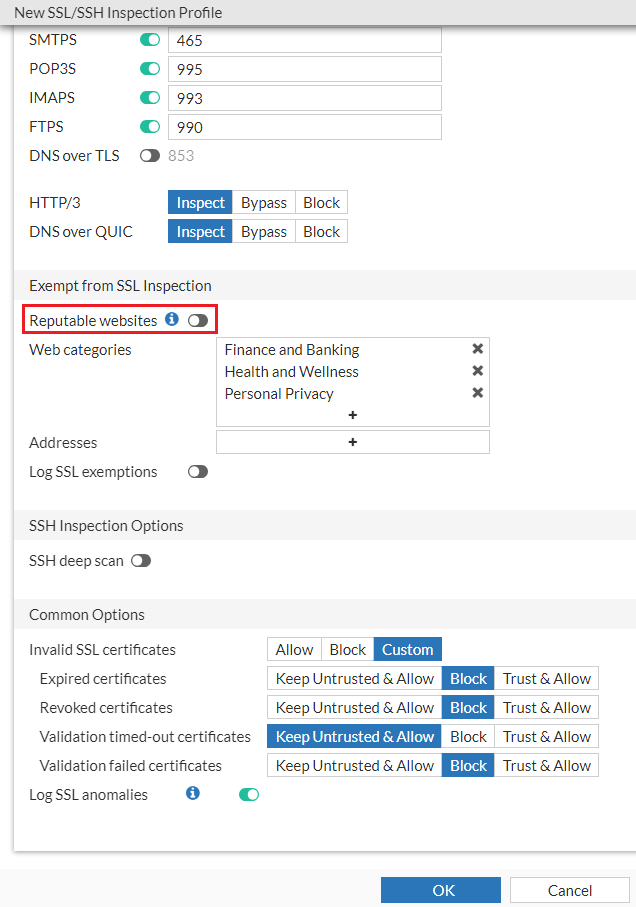 To exclude reputable websites from SSL deep inspection, enable the Reputable websites option under SSL/SSH Inspection.