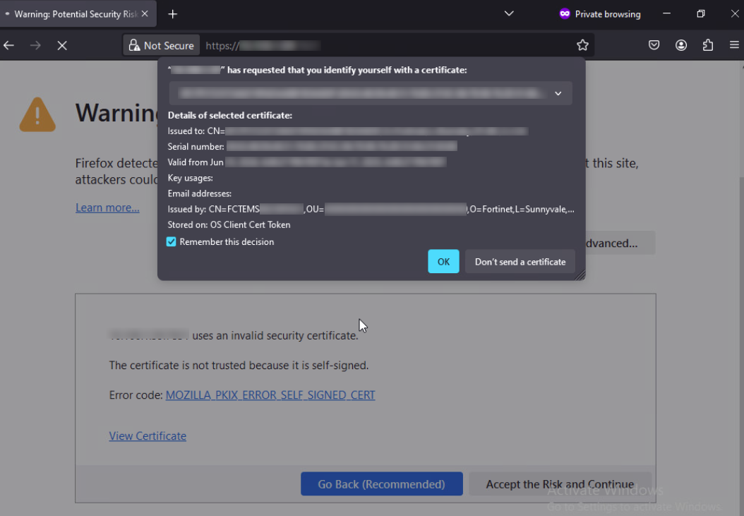 In this example, a client connects to qa.fortinet.com and is prompted for a client certificate.