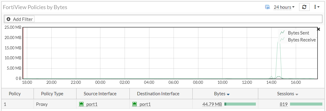 - Time Display drop-down menu (options: 5 minutes, 1 hour, or 24 hours; if you are using FortiAnalyzer, you can select longer time periods)