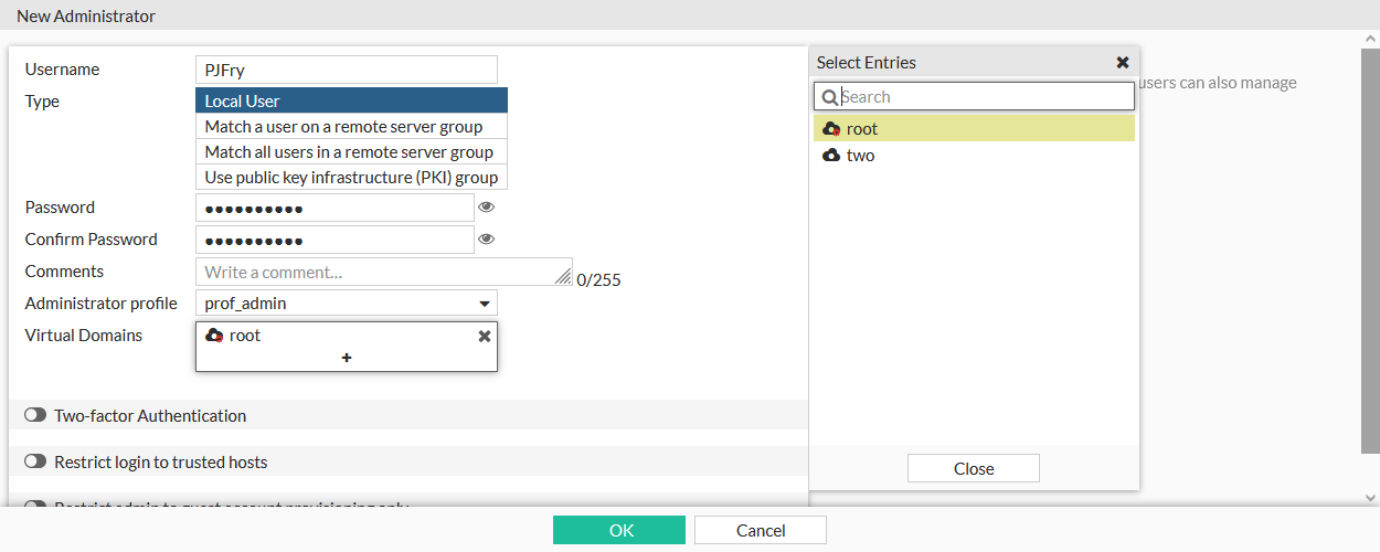 In the Virtual Domains field, add the VDOMs that the administrator will be assigned to.