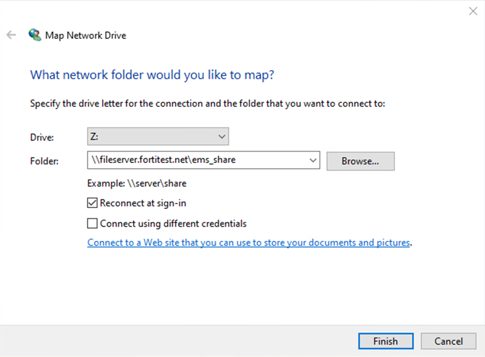 The map network drive configuration should be the last step after configuring the FortiProxy. The following example shows the mapped drive: