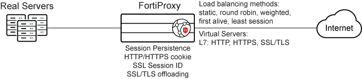 The load balancer supports HTTP, HTTPS, IMAPS, POP3S, SMTPS, and SSL/TLS protocols. Session persistence is supported based on the SSL session ID based on an injected HTTP cookie, or based on the HTTP or HTTPS host. SSL/TLS load balancing includes protection from protocol downgrade attacks. Server load balancing is supported on most FortiProxy devices and includes up to 10,000 virtual servers on high-end systems.