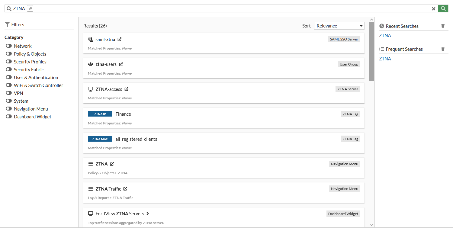 In this example, searching for the word ZTNA yields the following results: