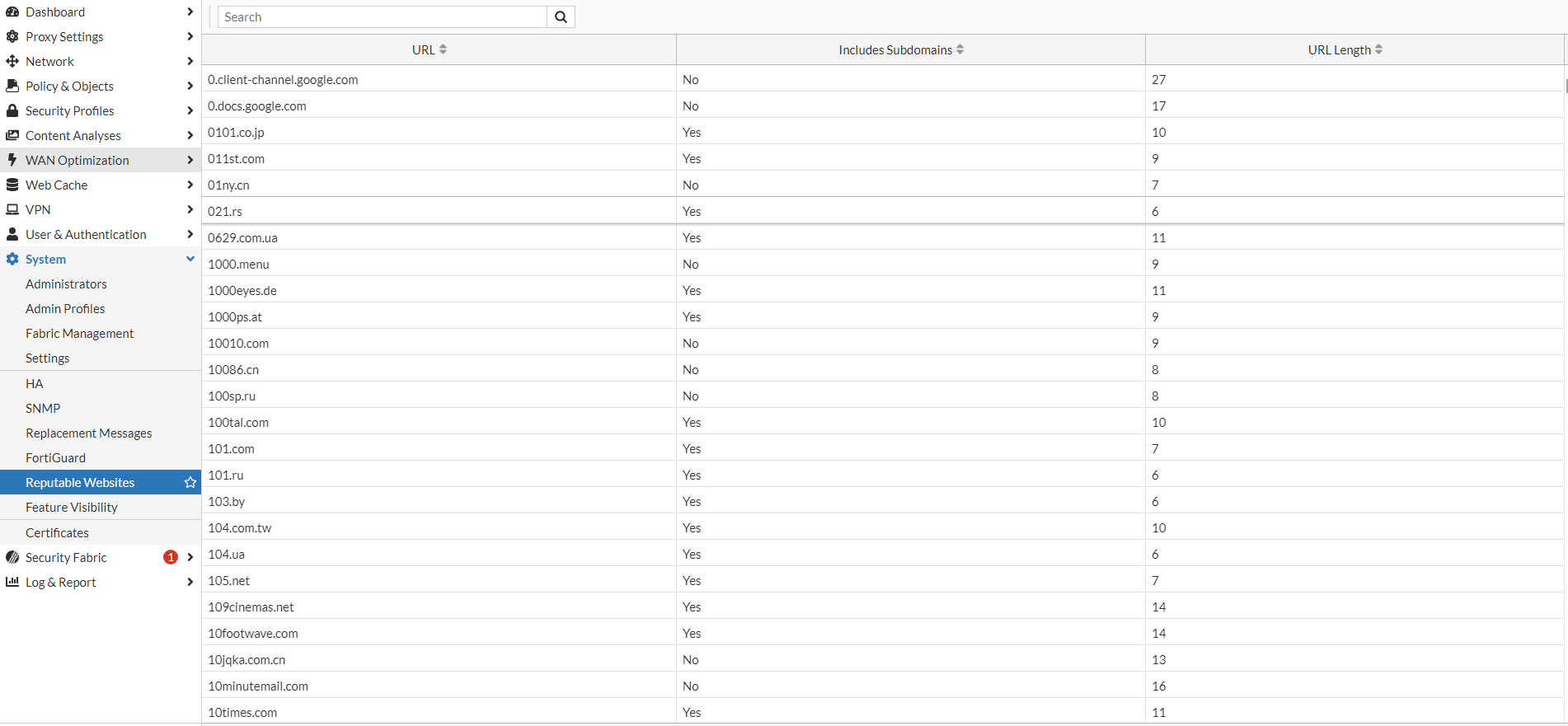 Use the System > Reputable Websites page to view the list of trusted URLs by FortiProxy. The list is synchronized from FortiGuard. You can search the list for an IP or domain.