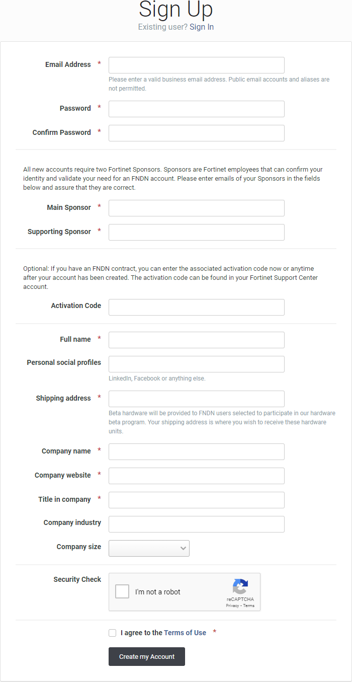All FNDN users must be sponsored by two Fortinet employees. The sponsors must be able to confirm the user’s identity and need for access. Approvals from both sponsors are required before access is granted to new users. The sponsors' email addresses are required to create a new FNDN account.