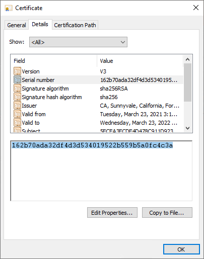 In Windows, FortiClient automatically installs certificates into the certificate store. The certificate information in the store, such as certificate UID and SN, should match the information on EMS and the FortiProxy.