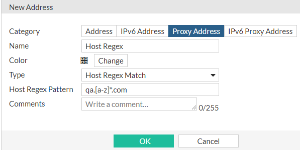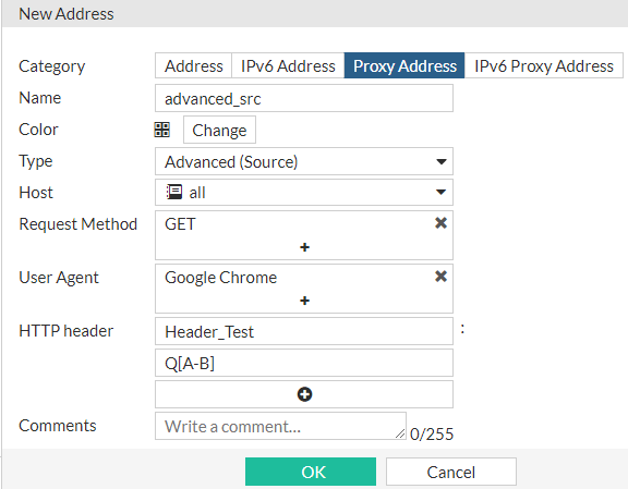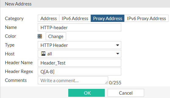 In this address type, a user can create a HTTP header as a regular expression. Once created, the header address can be selected as a source of a firewall policy. This means that a policy will only allow or block requests where the HTTP header matches the regular expression.