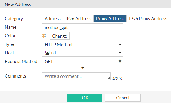 In this address type, a user can create an address based on the HTTP request methods that are used. Multiple method options are supported, including: CONNECT, DELETE, GET, HEAD, OPTIONS, POST, PUT, and TRACE. Once created, the address can be selected as a source of a firewall policy. This means that a policy will only allow or block requests that match the selected HTTP method.