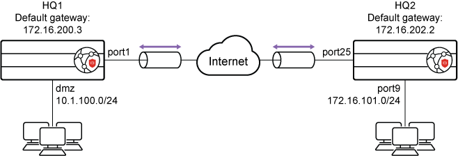 config system interface edit "port1" set vdom "root" set ip 172.16.200.1 255.255.255.0 next end config router static edit 1 set gateway 172.16.200.3 set device "port1" next end - Configure HQ2.