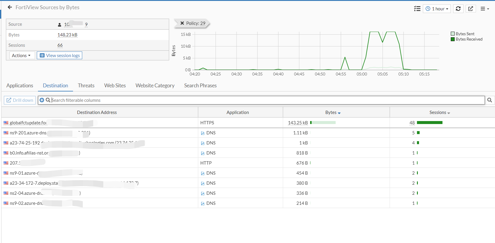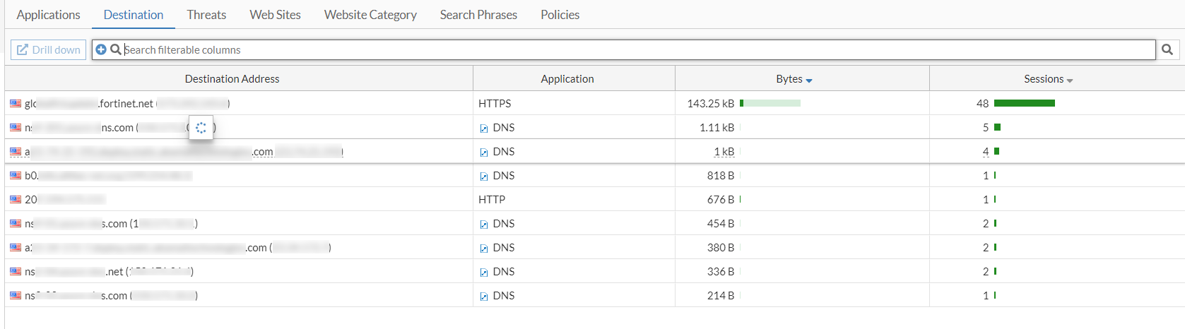 On a FortiView page with enough entries, the graph in the historical view automatically hides when you scroll down the page.