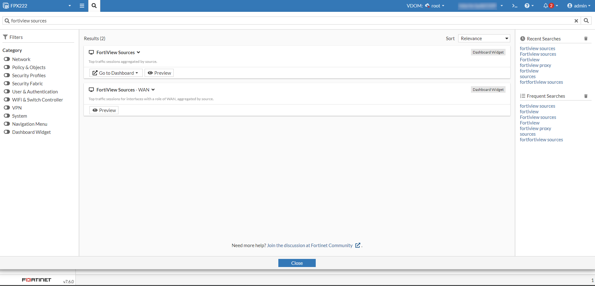 FortiView pages can be found using the global search.