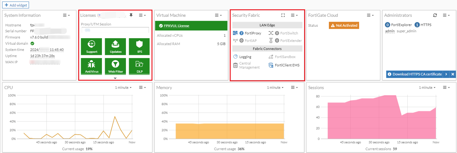 The Licenses and Security Fabric widgets are updated.