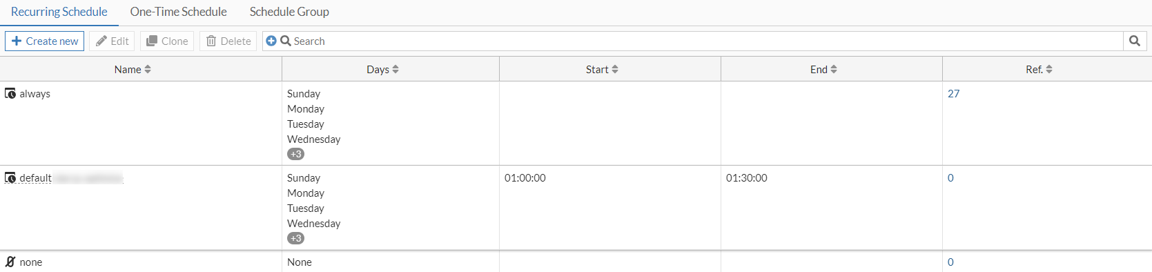 The Policy & Objects > Schedules page includes tabs for Recurring Schedule, One-Time Schedule, and Schedule Group.
