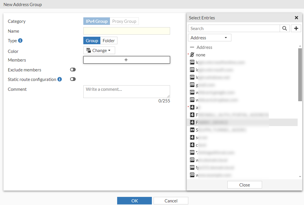 When adding members to an address group, a dropdown is included in the Select Entries pane to display specific options.
