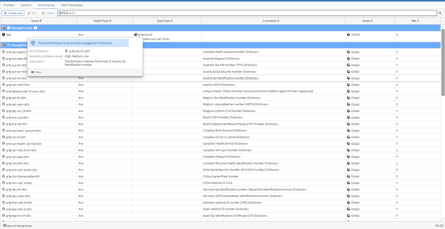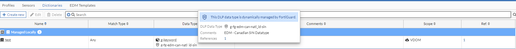 - Clearly distinguish DLP dictionaries and sensors by grouping them as Managed Locally and Managed by FortiGuard.