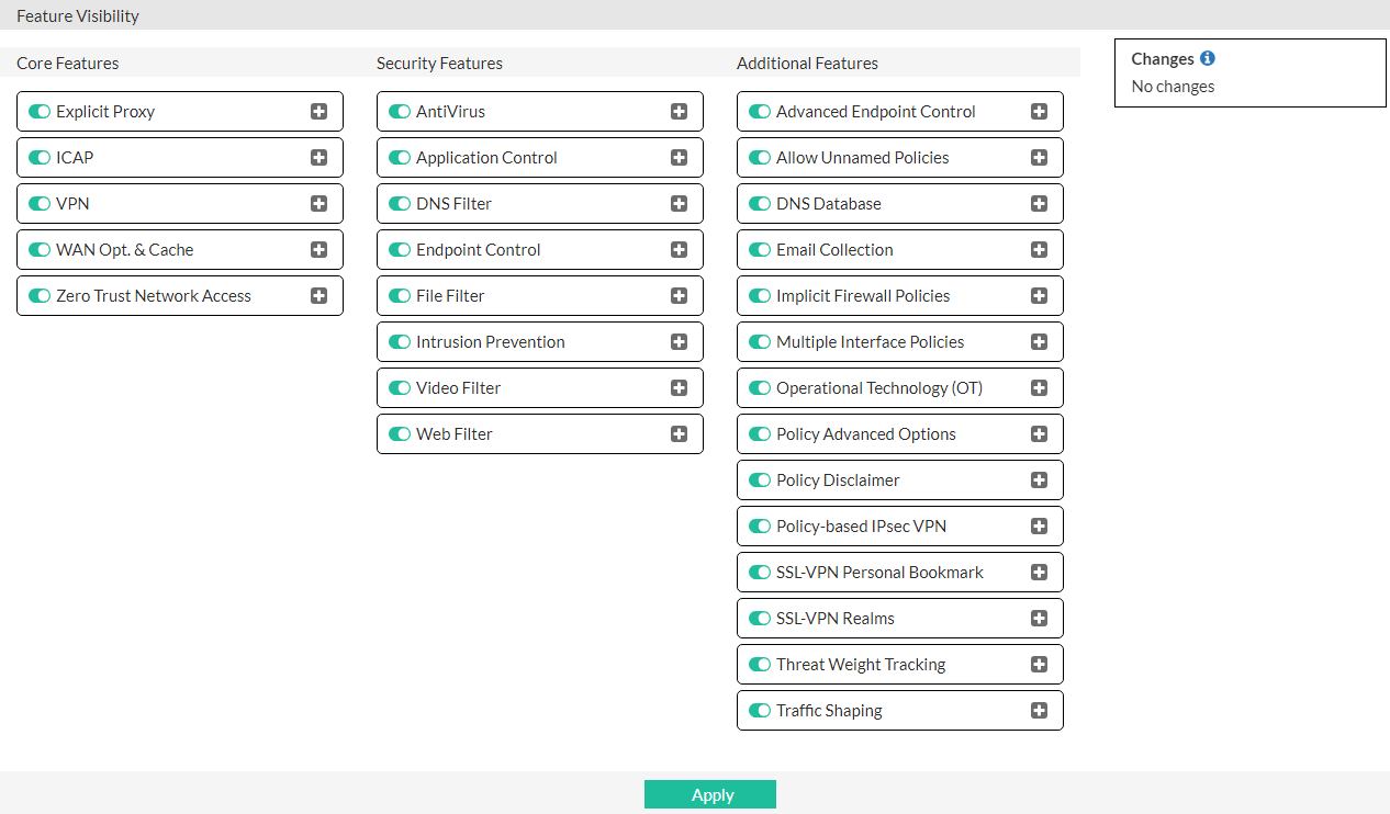 Various FortiProxy features can be enabled or disabled as required. Disable features are not shown in the GUI.