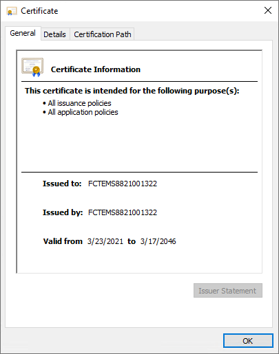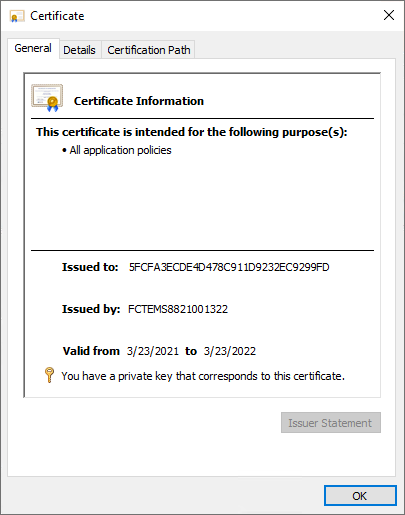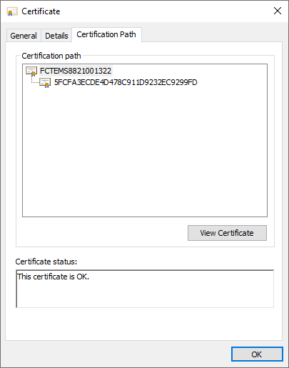 In Windows, FortiClient automatically installs certificates into the certificate store. The certificate information in the store, such as certificate UID and SN, should match the information on EMS and the FortiProxy.