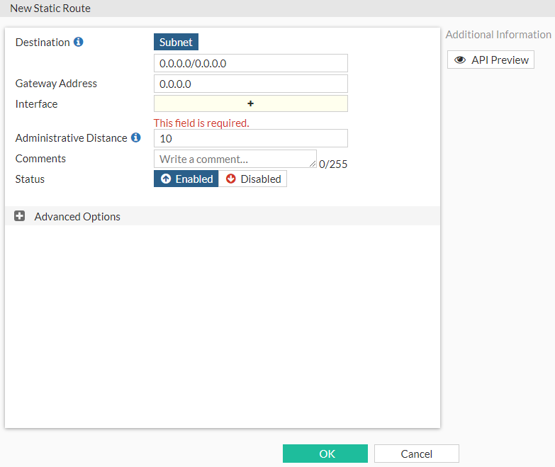 Select Enabled or Disabled to set the status of the new static route. |
