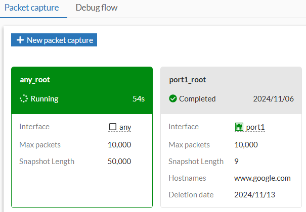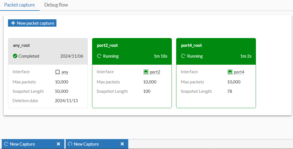 Multiple packet captures can be run simultaneously for when many packet captures are needed for one situation. For example, ingress and egress interfaces can be captured at the same time to compare traffic or the physical interface and VPN interface can be captured using different filters to see if packets are leaving the VPN.