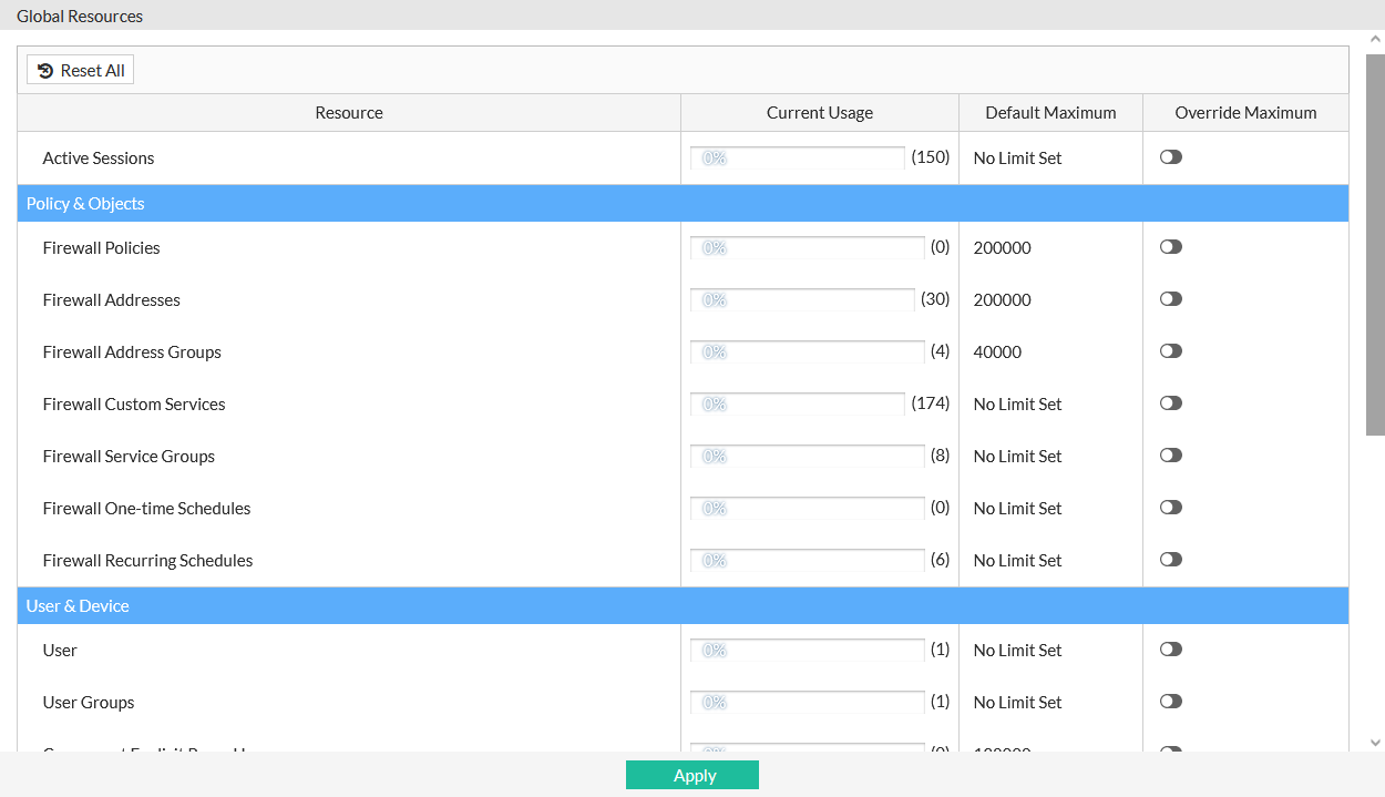 In the Global VDOM, go to System > Global Resources.