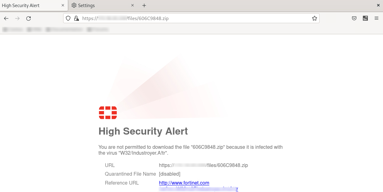When potential infections are blocked by FortiNDR inline inspection, a replacement message appears. See Replacement Messages for more information. An infection blocked over HTTP looks similar to the following: