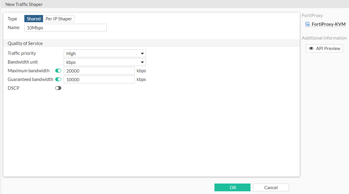 - Repeat the above steps to create another traffic shaper named 1Mbps with the Traffic Priority set to Low, the Max Bandwidth set to 10000, and the Guaranteed Bandwidth set to 1000.