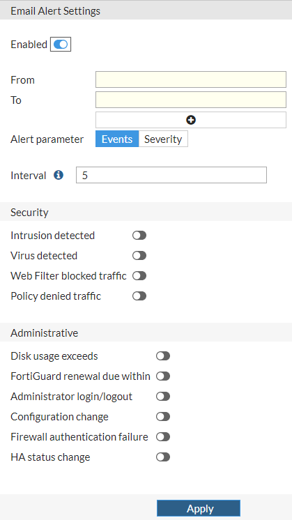 - In Log & Report > Email Alert Settings, toggle Enabled.